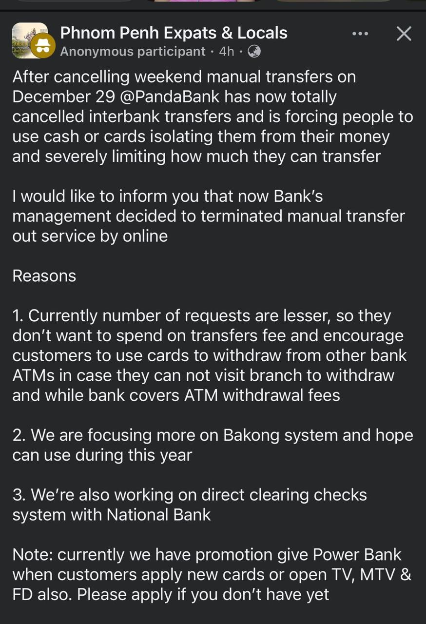 根据网络流传的网友帖子及相关信息,柬埔寨胖大银行(Panda Commercial Bank Plc.,简称Panda Bank)已暂停或终止部分银行间转账服务(interbank transfer),并向客户发布说明。该银行鼓励客户转向其他渠道提取资金,并强调此调整系运营策略优化,而非系统性风险所致。
