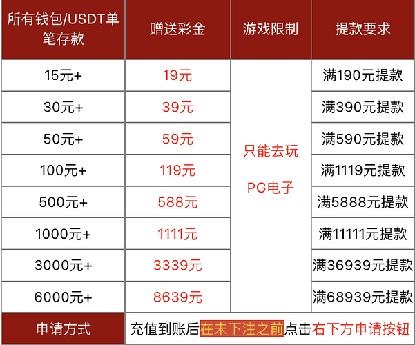 **注意:**本活动不与《PG电子以小博大》共享,一笔存款只能申请一项优惠!街机游戏,棋牌百家乐,21点,电子桌面游戏不参与此活动。