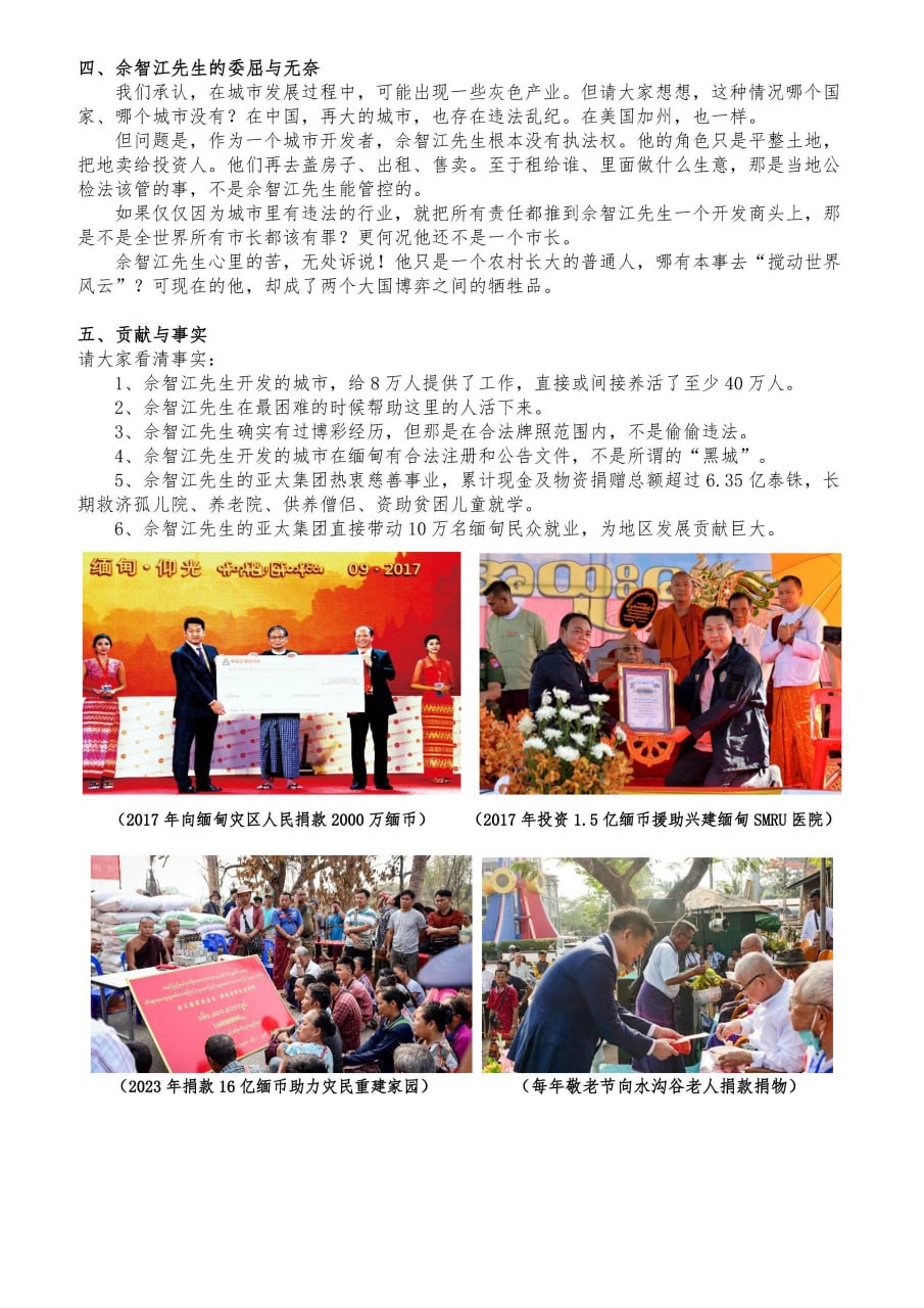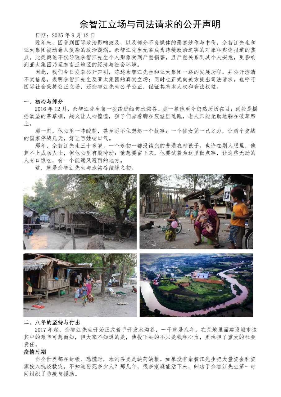 发展历程与合法经营:声明回顾了佘智江先生自20世纪初以来在东南亚的创业历程,从早期从事合法商业活动起步,逐步发展为亚太国际控股集团的创始人和主席。集团业务主要聚焦于房地产开发、销售、租赁、城市运营以及水疗服务等领域,项目遍及柬埔寨、菲律宾和缅甸等地。其中,缅甸水沟谷“亚太新城”项目作为中缅经济走廊的重要组成部分,曾获得当地政府签约认可,并积极推动基础设施建设和就业机会创造。声明强调,所有项目均遵守东道国法律法规,未涉及任何非法活动。