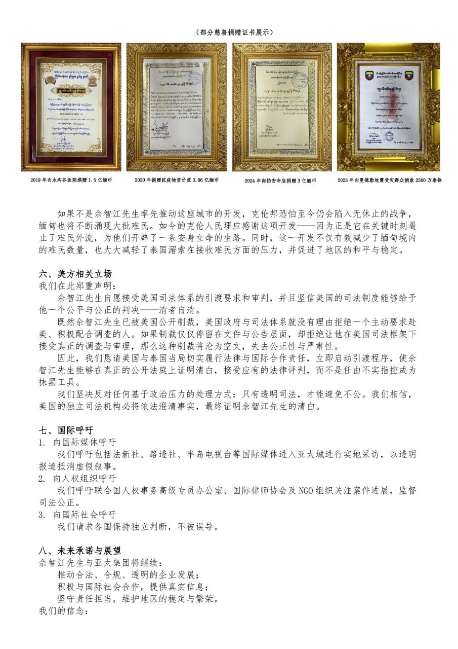 法律立场与对不实指控的回应:针对近年来围绕佘智江先生被捕、引渡请求以及集团项目涉嫌非法活动的指控,声明提供了详尽的法律分析和事实澄清。佘智江先生于2022年在泰国被捕后,其案件涉及国际刑警组织红色通缉令和中国司法程序,但声明指出,这些指控多基于跨境赌博和电信诈骗的传闻,而集团已通过法律渠道积极配合调查,并寻求公正司法程序。声明特别回应了2025年美国财政部制裁名单的相关报道,强调集团实体(如缅甸亚太国际控股集团)已采取措施隔离任何潜在风险,并呼吁国际社会尊重东道国司法主权。同时,集团已向泰国和柬埔寨当局提交司法请求,寻求保护合法权益,包括保释权和人身安全保障。声明还提及,佘智江先生在狱中遭受的不当待遇(如殴打事件),并敦促相关方确保程序公正。